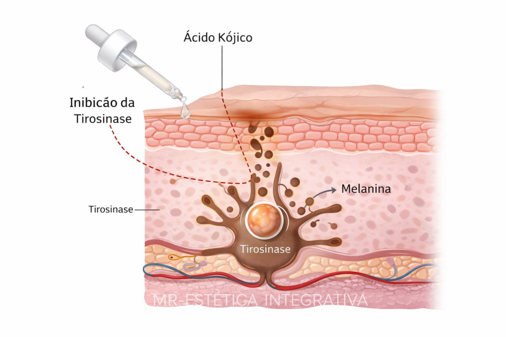 O ácido kójico atua inibindo a enzima tirosinase, responsável pela conversão da tirosina em melanina, reduzindo progressivamente a formação de pigmento sem causar destruição celular ou descamações profundas.