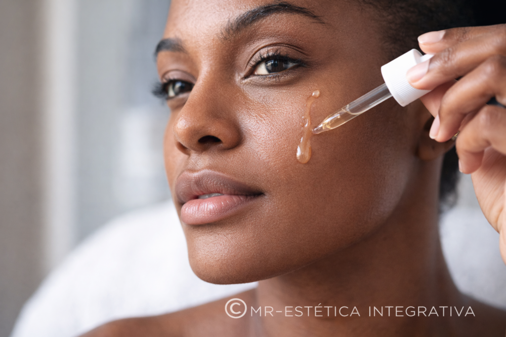 Pode usar com vitamina C? Sim. A combinação potencializa o efeito antioxidante e despigmentante.